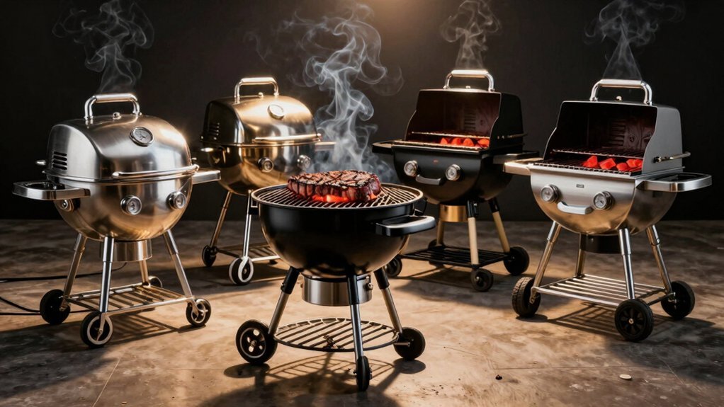 When you’re shopping for a charcoal grill designed for steaks, you’ll want to prioritize heat distribution uniformity and temperature control capability to achieve that perfect sear and consistent doneness. The cooking surface area and grate quality material matter equally, as they determine how many steaks you can cook simultaneously and how well your meat develops those desirable grill marks. Finally, don’t overlook lid design features, which directly impact heat retention and your ability to create the ideal cooking environment for premium cuts.
