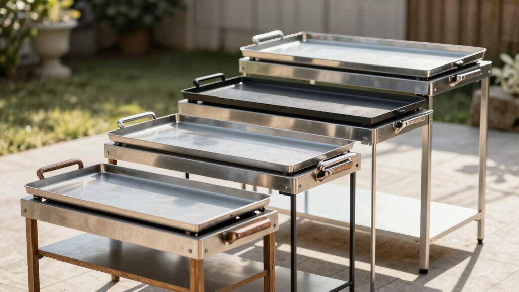 Selecting the right dimensions makes all the difference when you’re shopping for a flatgrill table. You’ll want a width between 17-31 inches and height around 28-30 inches to guarantee ergonomic cooking and meal prep. These measurements keep you comfortable while you’re working.