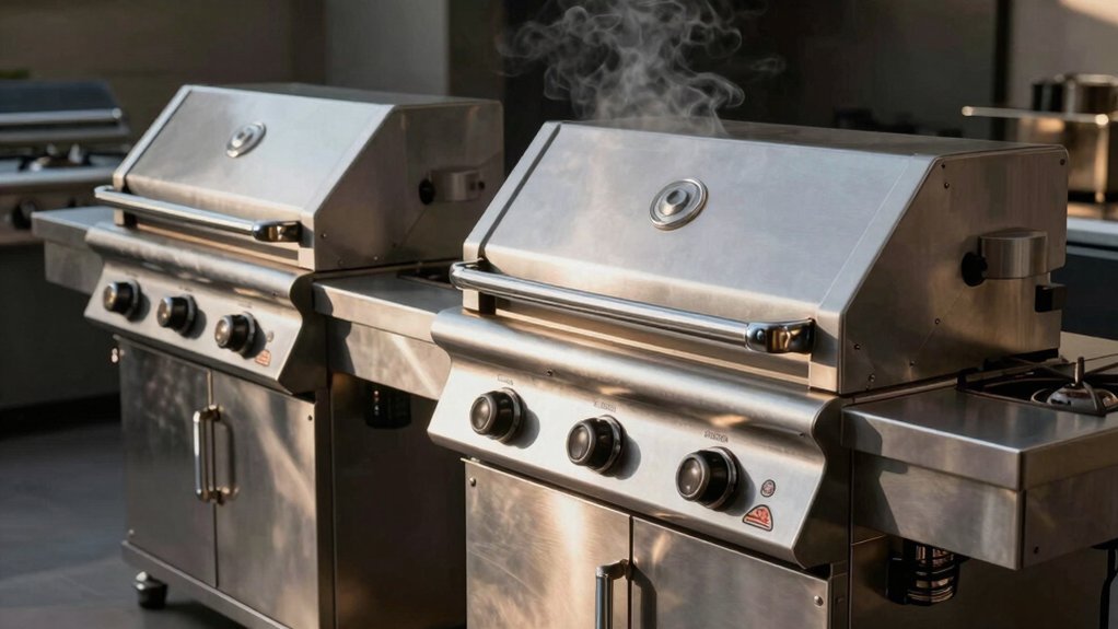 When you’re cooking multiple dishes on a grill with a side burner, uneven heat becomes your biggest enemy—hot spots can char one section of food while leaving another undercooked. You’ll want stainless steel burners and enameled flame tamers that distribute heat consistently across your cooking surface. Cast iron grates with porcelain coatings excel at heat retention and enable ideal searing. While a higher BTU rating suggests greater heating potential, focus on how well the grill manages and maintains that heat throughout. Built-in thermometers prove invaluable for monitoring temperature consistency, ensuring every area reaches your desired cooking temperature. These features combined create the reliable, even cooking that master chefs demand from their equipment.