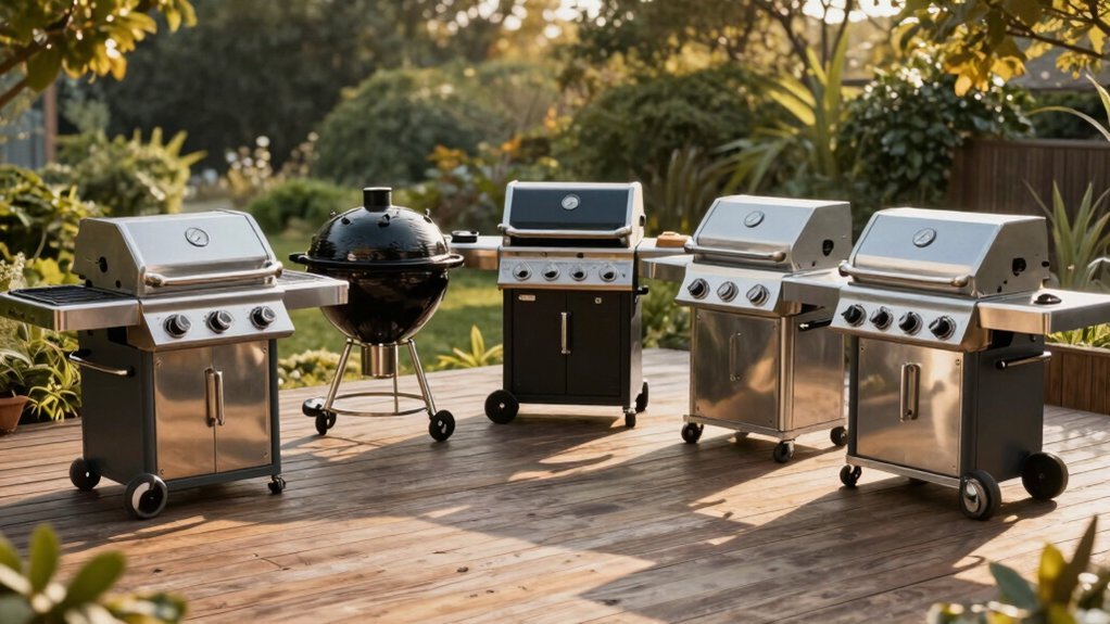 While heat control determines how well you’ll cook your food, the fuel type you select shapes your entire grilling experience. You’ll find three main options, each with distinct advantages for beginners.
