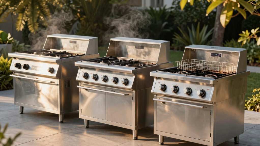 When you’re selecting a grill-fryer combo, you’ll want to evaluate material quality for long-term durability, assess temperature control capabilities to guarantee precise cooking, and verify the oil capacity meets your typical cooking volumes. You should also compare heating power and performance specs across models, as stronger heating elements deliver faster cooking times and more consistent results. Finally, consider portability and space efficiency based on your available outdoor area and whether you’ll need to move the unit frequently.