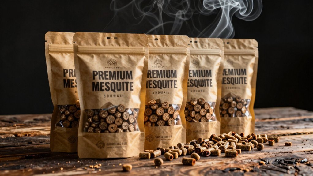 Selecting low-moisture mesquite pellets delivers cleaner smoke and robust flavor that genuinely enhances your grilled meats and vegetables. You’ll burn hotter, smoke more intensely, and enjoy superior cooking results. When shopping, prioritize moisture content as a key quality indicator for premium smoking performance.