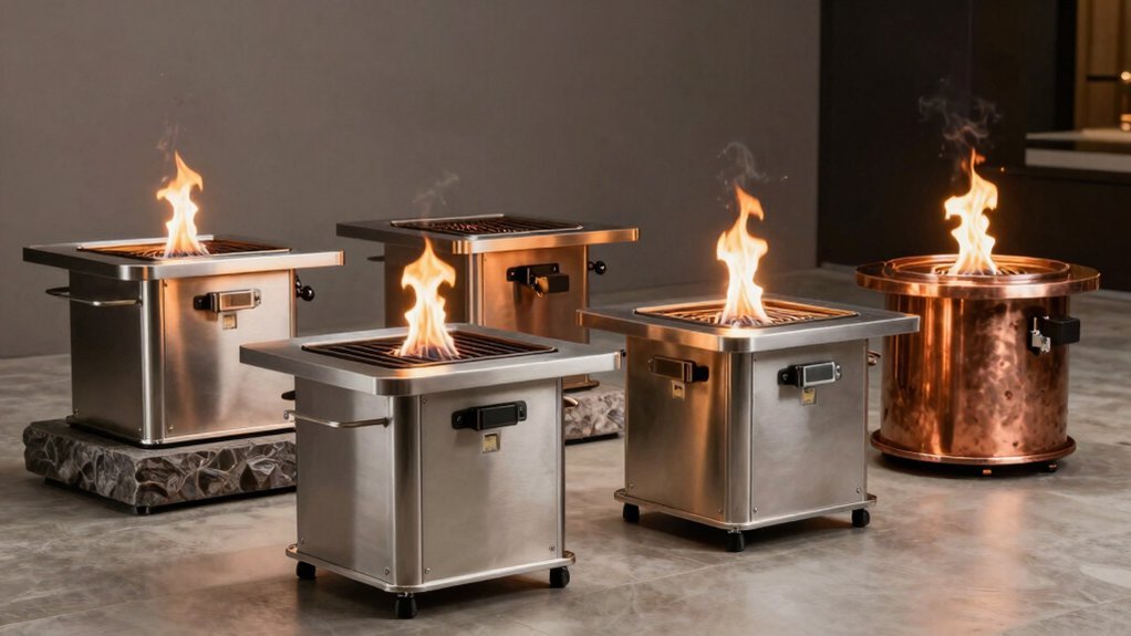 Most quality propane fire pits rely on powder-coated steel to withstand high temperatures and resist rust effectively. You’ll want to select models constructed with solid gauge steel, which provides enhanced structural integrity and stability during use. This reduces the risk of heat-related damage and guarantees your investment lasts for years.