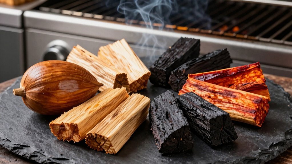 Because different wood types produce distinctly different flavors, selecting the right chips is essential to achieving your desired taste profile. You’ll want to match wood choice to your protein: mesquite pairs excellently with red meats, while lighter woods suit poultry and seafood. Hickory delivers a strong, hearty taste, whereas fruitwoods like apple or cherry offer sweeter, milder notes.