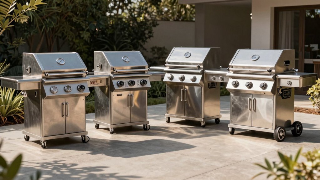 Your grill grates matter too. Porcelain-coated options distribute heat evenly and simplify cleanup while enhancing cooking performance. Don’t overlook mobility features either—all-terrain wheels and a stable chassis make repositioning your unit effortless.